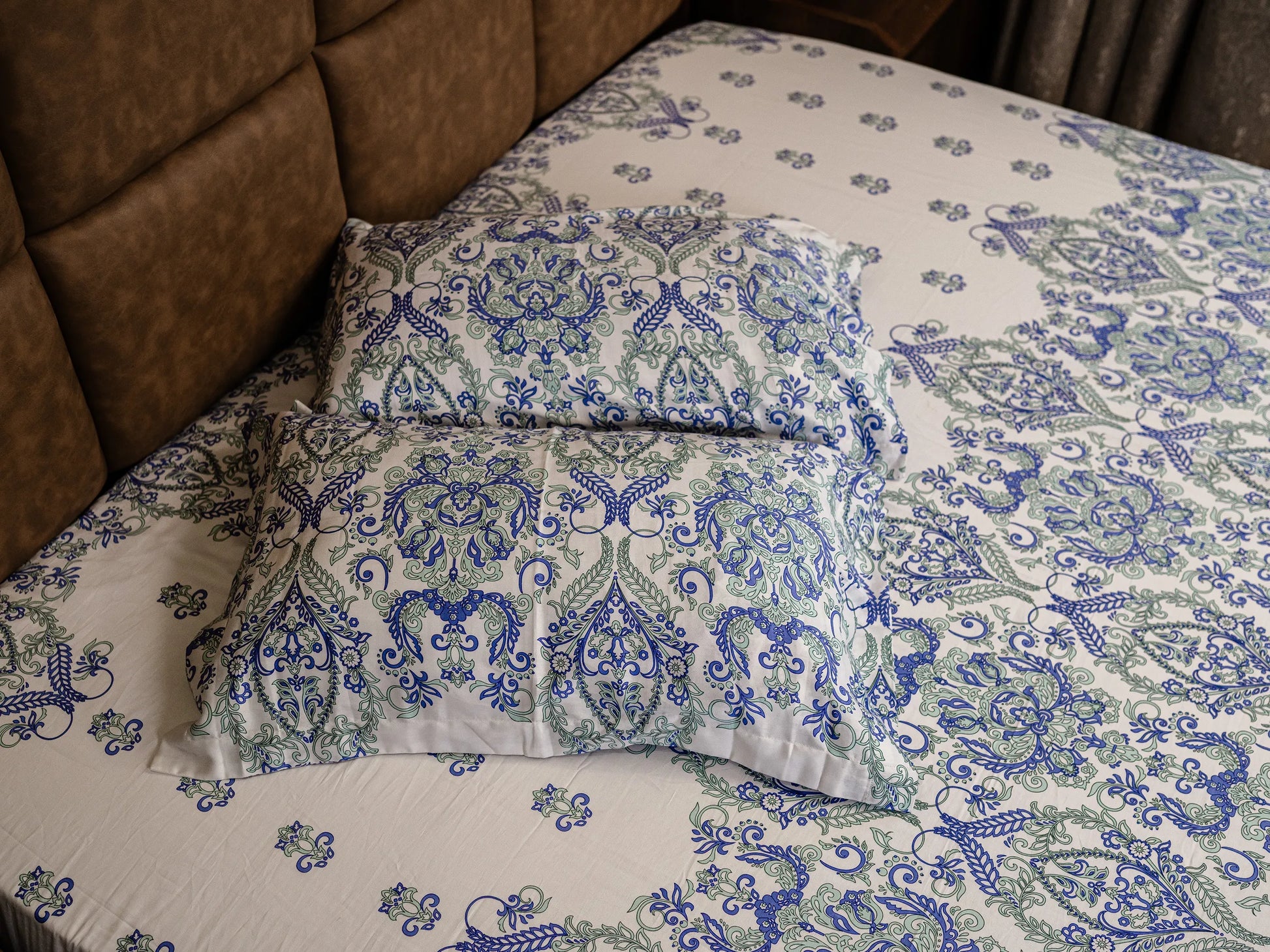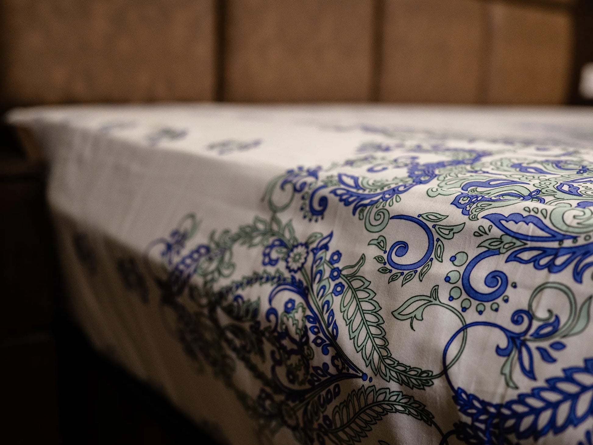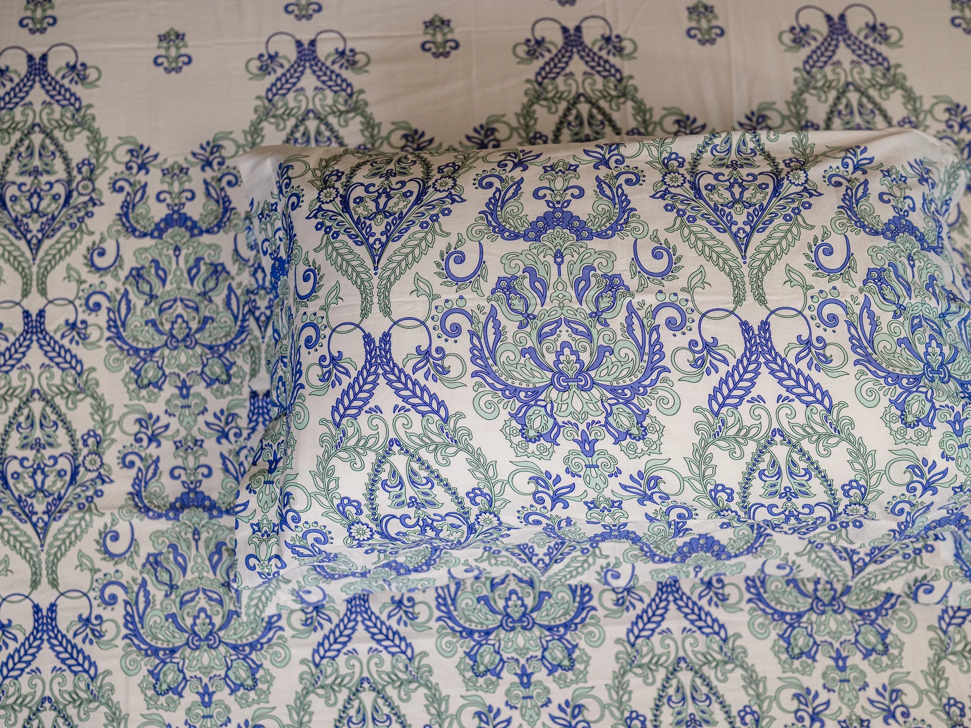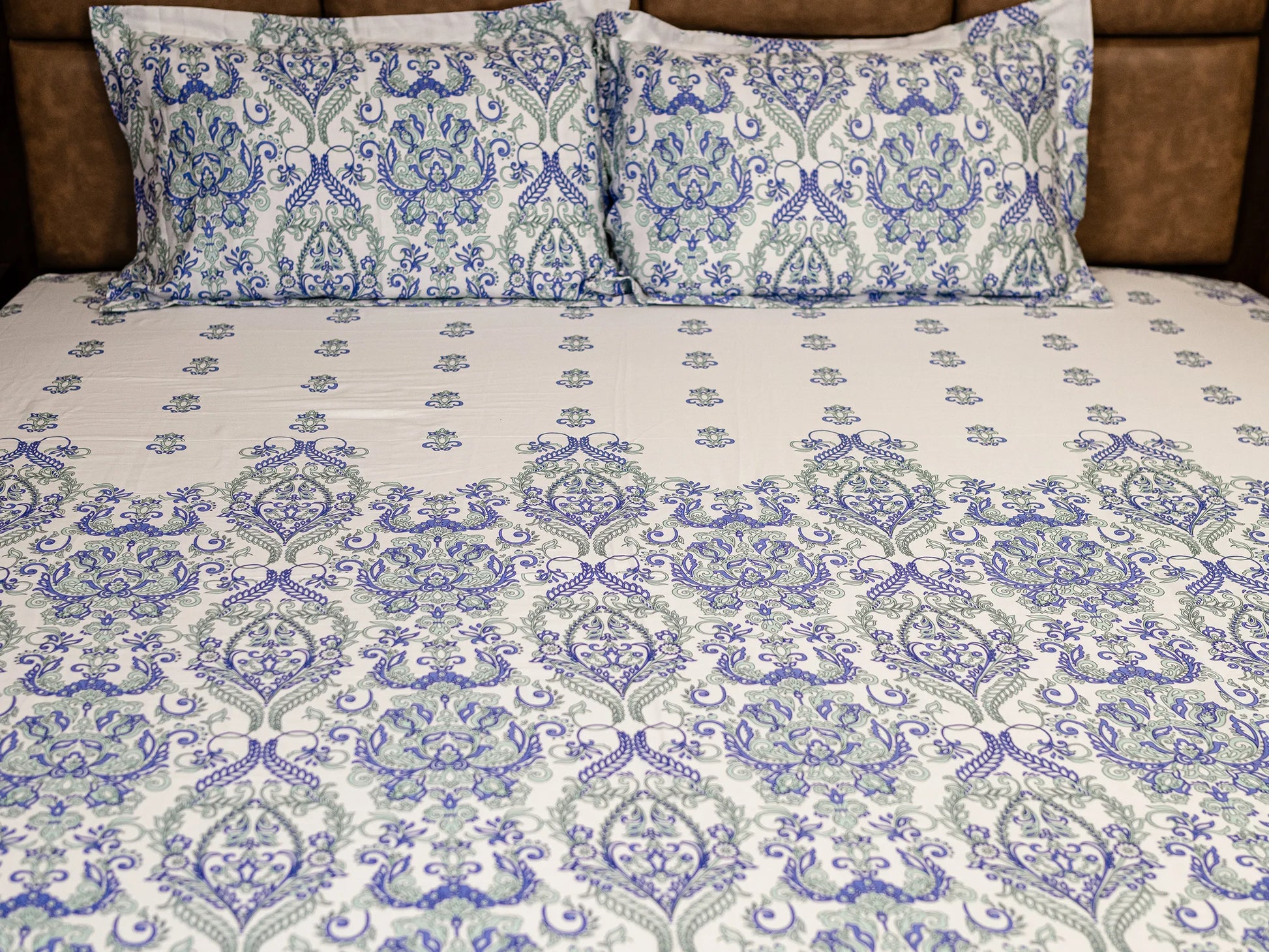 Experience the ultimate in luxury living with this premium 100% organic cotton bedsheet, featuring an intricately beautiful blue damask design that elevates any bedroom aesthetic. Boasting a superior 500 thread count, the fabric offers a silky-smooth touch and exceptional breathability for unparalleled sleep comfort night after night. Indulge in a sustainable yet sophisticated lifestyle with this high-end bedding, designed to provide a serene and elegant sanctuary for your rest.